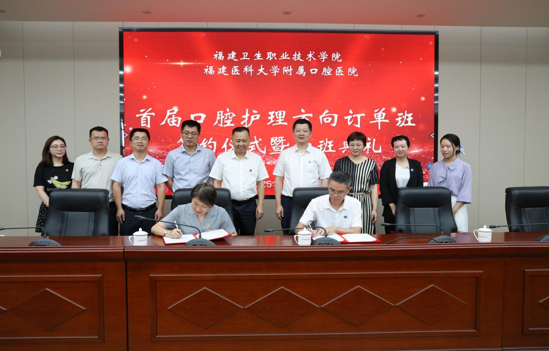 6月17日,我校與福建醫(yī)科大學(xué)附屬口腔醫(yī)院口腔護(hù)理方向訂單班簽約儀式暨開班典禮在厚德樓六樓會(huì)議室舉行。福建醫(yī)科大學(xué)附屬口腔醫(yī)院黨委副書記張尉(主持工作)、副院長(zhǎng)駱凱、護(hù)理部負(fù)責(zé)人危艷萍、護(hù)士長(zhǎng)謝暢暢,學(xué)校黨委書記曾武祈、副校長(zhǎng)朱扶蓉,教務(wù)處、護(hù)理學(xué)院、醫(yī)學(xué)院相關(guān)人員以及21名口腔護(hù)理方向訂單班學(xué)生共同參加開班儀式。