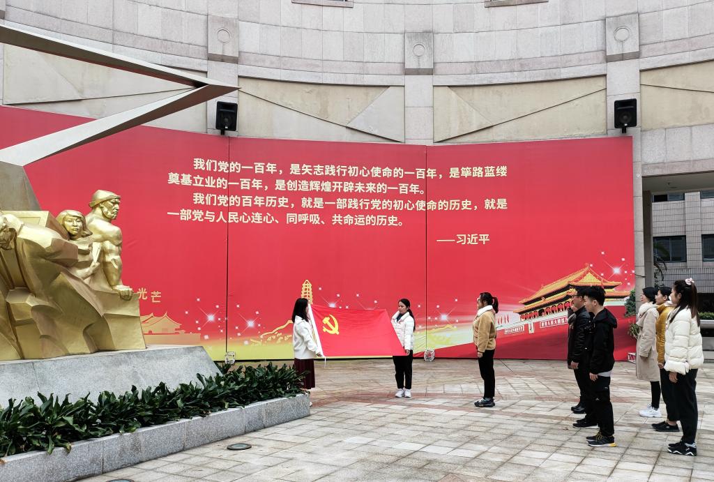 參觀結(jié)束后,在革命紀(jì)念館雕像《奮斗》旁,支部書記鄒艷輝帶領(lǐng)同志們面向著鮮艷的黨旗莊嚴(yán)宣誓,重溫入黨誓詞。入黨誓詞,是黨員對黨和人民作出的莊嚴(yán)承諾,也是黨員必須遵守的行為準(zhǔn)則。在革命歷史紀(jì)念館參觀學(xué)習(xí)后重溫入黨誓詞,更能促進(jìn)黨員同志們牢記入黨初心,堅定理性信念,強化黨性修養(yǎng)。