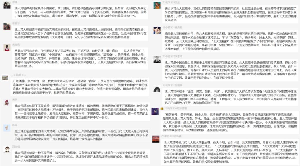 在支部群,師生們紛紛在線上發(fā)表自己的學(xué)習(xí)感言,表示要將北大荒精神應(yīng)用到學(xué)習(xí)工作中,積極參與并堅(jiān)決完成百草園的建設(shè)任務(wù),艱苦奮斗,敢闖敢試,為學(xué)校的建設(shè)增光添彩,爭做新時代的拓荒者和追夢人。