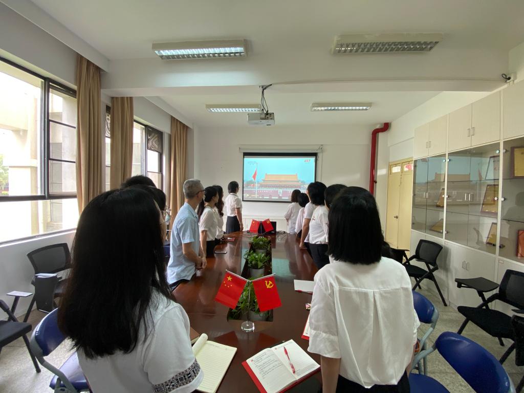 直播中,隨著國歌奏響,國旗緩緩上升,全體黨員教師面對屏幕上冉冉升起的五星紅旗行注目禮。