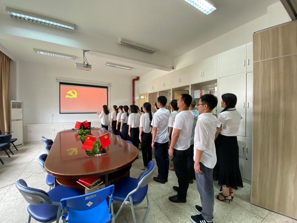直播結束后,在莊嚴的《國際歌》聲中,全體教師黨員矗立在黨旗前,在熊美蘭同志的帶領下重溫入黨誓詞。