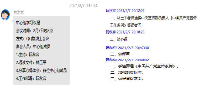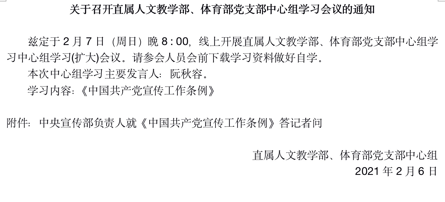 2月7日晚上,直屬人文教學(xué)部和體育部黨支部線上召開中心組學(xué)習(xí)(擴(kuò)大)會議,專題組織學(xué)習(xí)《中國共產(chǎn)黨宣傳工作條例》(以下簡稱《條例》)和傳達(dá)全國宣傳部長會議精神,會議由直屬人文教學(xué)部和體育部黨支部書記阮秋容同志主持,人文教學(xué)部和體育部領(lǐng)導(dǎo)班子、直屬黨支部支委委員、系辦人員等參加了會議。