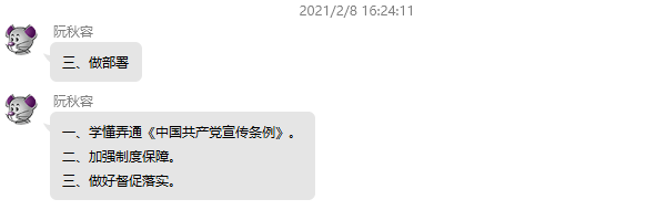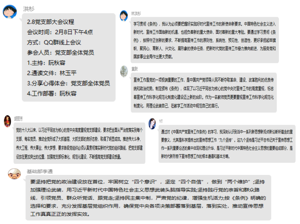 2月8日下午,直屬人文教學部和體育部黨支部在黨支部Q群召開線上黨員大會,專題組織學習《中國共產黨宣傳工作條例》(以下簡稱《條例》)和傳達全國宣傳部長會議精神,本次會議由直屬人文教學部和體育部黨支部阮秋容主持,支部全體黨員參加了會議。