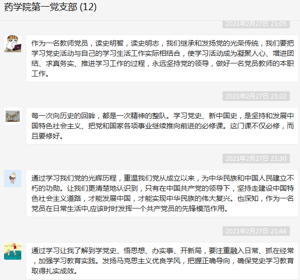為深入貫徹習(xí)近平總書記在黨史學(xué)習(xí)教育動(dòng)員大會(huì)上的重要講話精神,引導(dǎo)支部黨員學(xué)史明理、學(xué)史增信、學(xué)史崇德、學(xué)史力行,2021年2月27日,藥學(xué)院第一黨支部在線上開展“學(xué)黨史、守初心、強(qiáng)黨性、擔(dān)使命”主題黨日活動(dòng),活動(dòng)由支部書記何舒瀾主持。