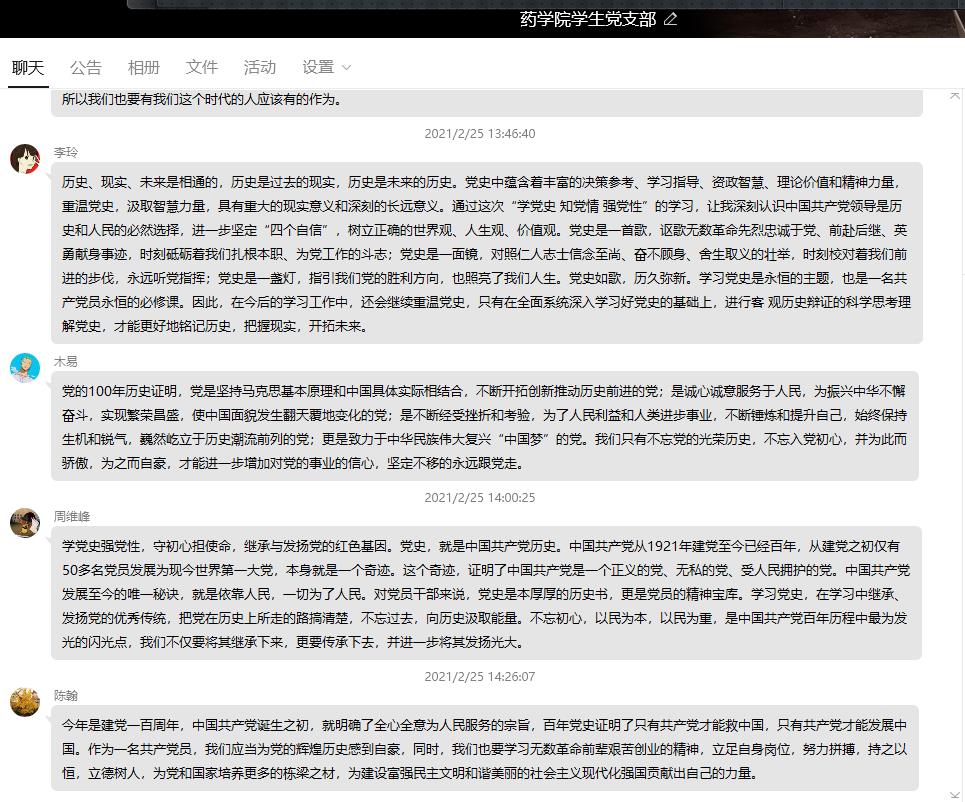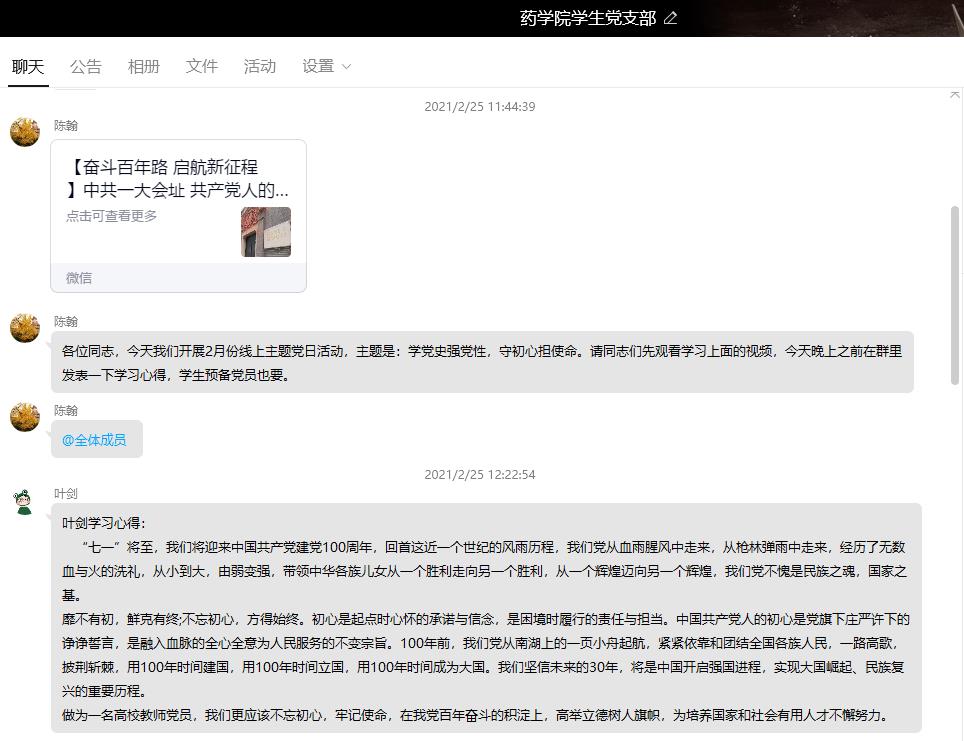 2月25日,藥學院學生黨支部組織開展“學黨史強黨性、守初心擔使命”主題黨日活動,支部黨員集體觀看“奮斗百年路 啟航新征程”短視頻,支部書記陳翰主持活動。