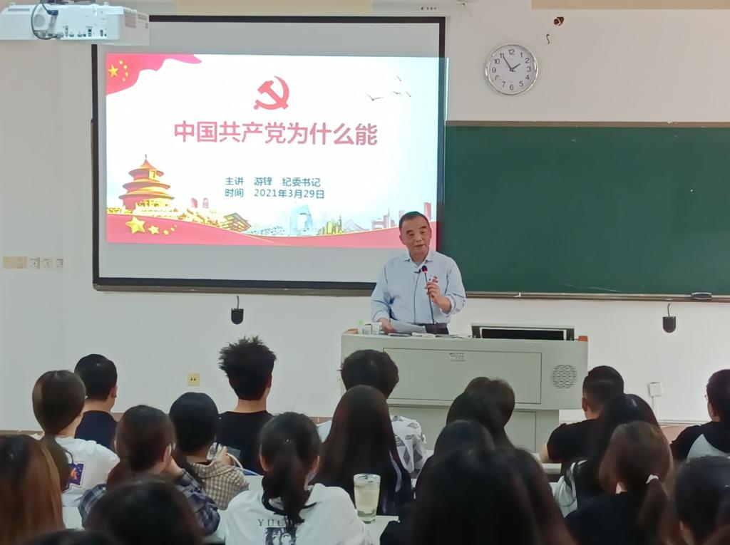 2021年3月29號,我校紀委書記游鋒以“中國共產(chǎn)黨為什么能”為主題,在教學樓110教室給20級藥學301、302班的學生開展一場別開生面的“開學第一課”,通過深入淺出的講述,加深了學生們對黨史的理解和感悟。