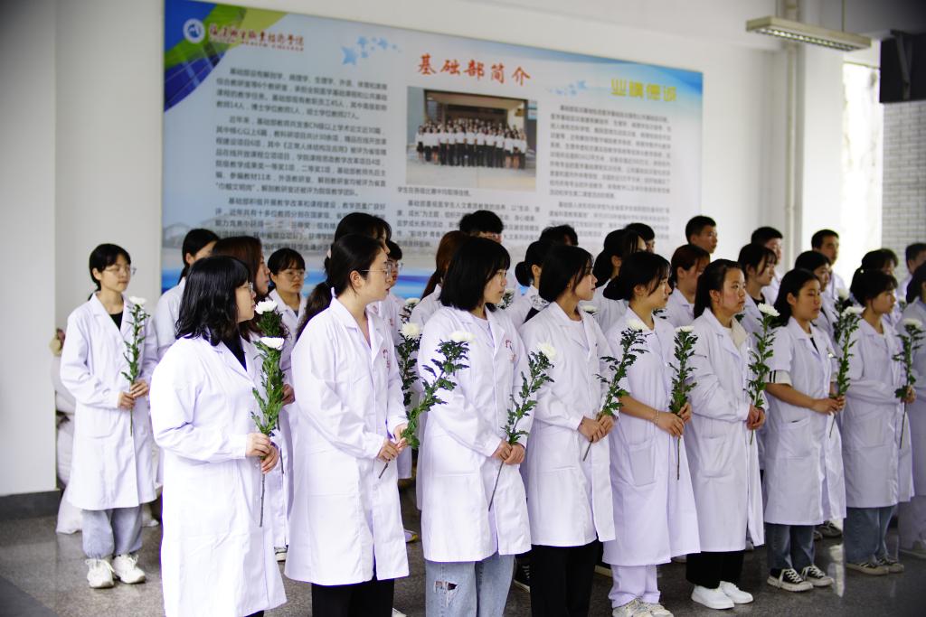 參加活動(dòng)的師生集體行默哀禮,感恩無言良師,隨后大家向大體老師鞠躬并敬獻(xiàn)鮮花,表達(dá)敬意與追思。