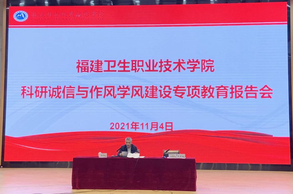 為進(jìn)一步弘揚(yáng)求真務(wù)實(shí)的學(xué)術(shù)精神,營(yíng)造風(fēng)清氣正的良好科研生態(tài),2021年11月4日,我校在學(xué)術(shù)報(bào)告廳舉辦科研誠(chéng)信與作風(fēng)學(xué)風(fēng)建設(shè)專項(xiàng)教育報(bào)告會(huì)。本次報(bào)告會(huì)邀請(qǐng)福建省誠(chéng)信促進(jìn)會(huì)黨委副書(shū)記林鴻堅(jiān)、福建省誠(chéng)信促進(jìn)會(huì)副會(huì)長(zhǎng)黃開(kāi)良來(lái)校講座。校長(zhǎng)許能鋒、黨委副書(shū)記李美華、紀(jì)委書(shū)記游鋒、副校長(zhǎng)鄭翠紅、全體中層干部、專業(yè)帶頭人、教研室主任、各院系教師代表參會(huì),會(huì)議由鄭翠紅主持。
