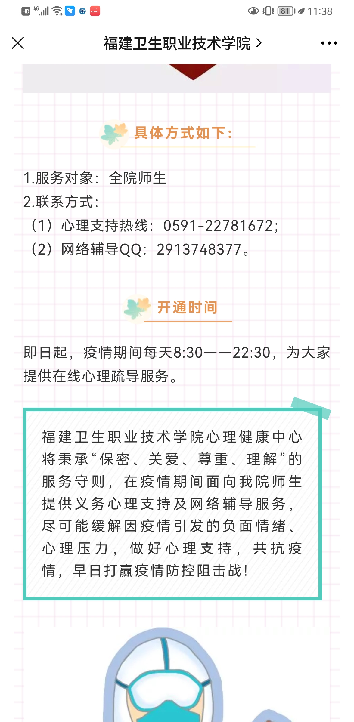 輔導(dǎo)員們還有另一個(gè)身份,他們也是中共黨員,我省疫情發(fā)生以后,他們迅速集結(jié)為學(xué)生管理黨員突擊隊(duì),深入校園疫情防控的各個(gè)角落,關(guān)心學(xué)生的學(xué)習(xí)和生活,為學(xué)生排憂解難,處處飄揚(yáng)著鮮紅的黨旗。在這沒(méi)有硝煙的戰(zhàn)“疫”中,每位閩衛(wèi)院輔導(dǎo)員都心系學(xué)生,沖在前線,守崗履責(zé),踐行著身為一名高校輔導(dǎo)員的初心和使命。相信通過(guò)全校師生的共同努力,我們一定能夠打贏這場(chǎng)疫情防控保衛(wèi)戰(zhàn)。