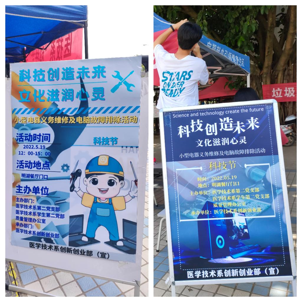 科技創(chuàng)造未來,技能造福人類。為響應(yīng)學(xué)校提高大學(xué)生科學(xué)素質(zhì)的號召,推進高??茖W(xué)技術(shù)發(fā)展,秉承“業(yè)精德誠”的校訓(xùn),近日,醫(yī)學(xué)技術(shù)系第二黨支部、質(zhì)量管理辦公室,醫(yī)學(xué)技術(shù)系學(xué)生第一黨支部及學(xué)生第二黨支部聯(lián)合系團總支創(chuàng)新創(chuàng)業(yè)部在明湖廣場舉辦以“科技創(chuàng)造未來,文化滋潤心靈”為主題的第二屆科技節(jié)之小型電器義務(wù)維修及電腦故障排除活動。醫(yī)學(xué)技術(shù)系及質(zhì)量管理辦公室領(lǐng)導(dǎo)蒞臨指導(dǎo),各黨支部的教師和學(xué)生黨員以及入黨積極分子參與活動。