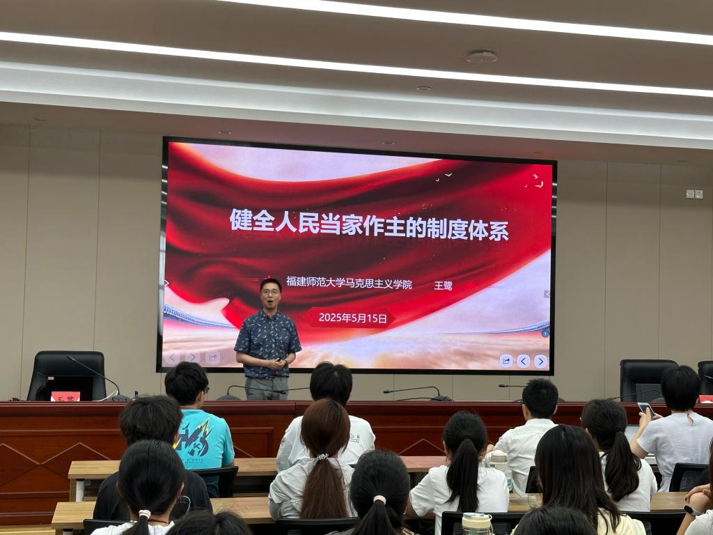 為深入貫徹落實(shí)黨的二十大和二十屆三中全會(huì)精神,推動(dòng)新時(shí)代思想政治理論課改革創(chuàng)新,提升全校師生對(duì)中國(guó)特色社會(huì)主義制度體系的理解,5月15日,我校邀請(qǐng)福建師范大學(xué)馬克思主義學(xué)院副教授王鷺在厚德樓六樓會(huì)議室作題為《健全人民當(dāng)家作主的制度體系》專題講座。講座由馬克思主義學(xué)院黨總支副書記賴文金主持,馬克思主義學(xué)院全體專兼職教師、學(xué)生代表參加。