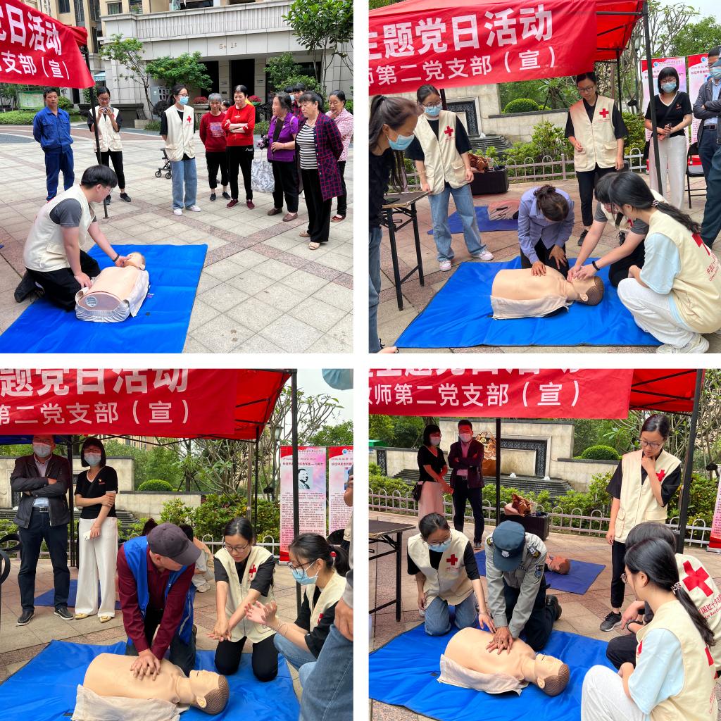 在醫(yī)學(xué)院教師第二黨支部黨員教師的指導(dǎo)下,醫(yī)學(xué)院紅十字會的同學(xué)們還開展了急救知識宣傳和現(xiàn)場心肺復(fù)蘇術(shù)技能培訓(xùn),吸引了保安師傅、物業(yè)大姐、社區(qū)居民、青少年等各類人群前來參與。