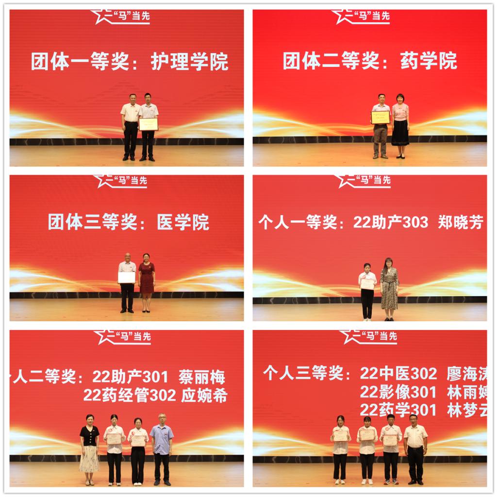 經(jīng)過激烈角逐,護(hù)理學(xué)院榮獲團(tuán)體一等獎(jiǎng),藥學(xué)院榮獲團(tuán)體二等獎(jiǎng),醫(yī)學(xué)院榮獲團(tuán)體三等獎(jiǎng)。22助產(chǎn)303鄭曉芳獲得個(gè)人一等獎(jiǎng),22助產(chǎn)301蔡麗梅、22藥經(jīng)管302應(yīng)婉希獲得個(gè)人二等獎(jiǎng),22中醫(yī)302廖海濤、22影像301林雨婷、22藥學(xué)301林夢(mèng)云獲得個(gè)人三等獎(jiǎng),22衛(wèi)管301鐘曉清等19名同學(xué)獲得個(gè)人優(yōu)勝獎(jiǎng)。