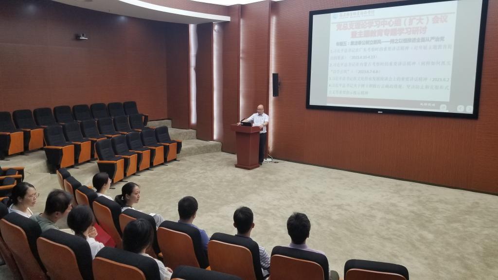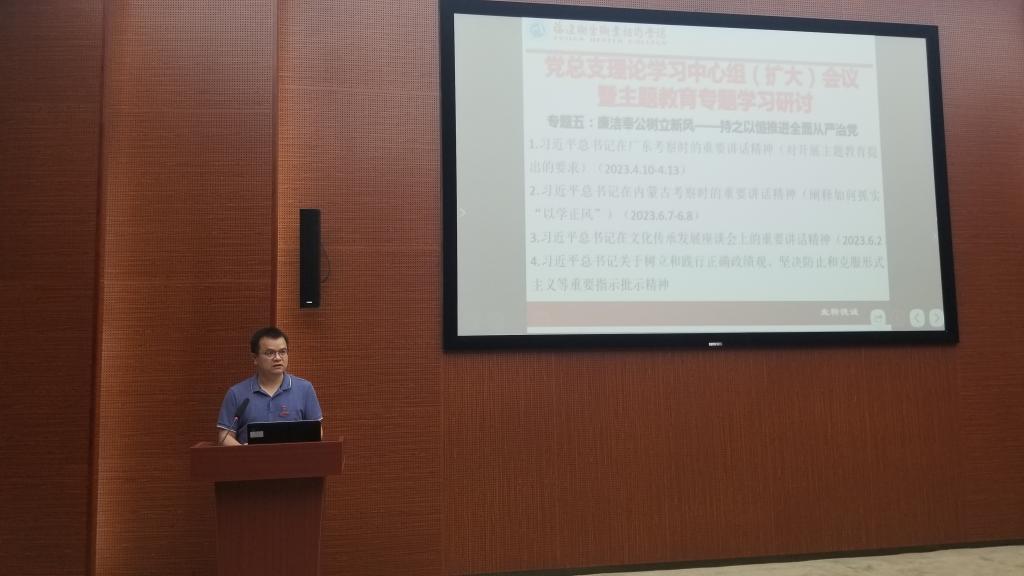 參觀結束后,全體中心組成員在博物館多功能廳召開黨總支理論學習中心組(擴大)會議暨主題教育專題學習研討,醫(yī)學院黨總支書記邱滾忠主持會議。與會人員圍繞主題教育專題五:廉潔奉公樹立新風——持之以恒推進全面從嚴治黨進行集中學習研討。醫(yī)學院副院長鄧元榮、副書記陳潔結合專題學習進行交流分享。
