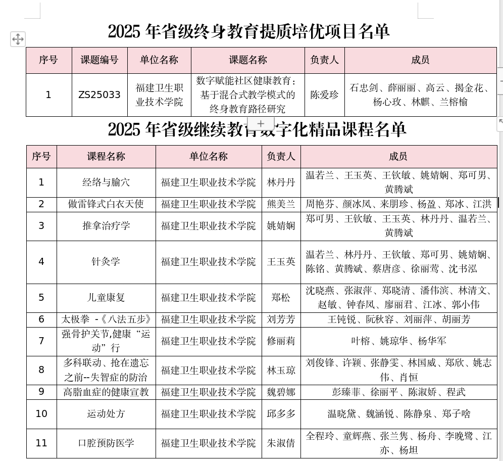 近日,福建省教育廳公布2025年省級終身教育重點項目名單,我校憑借扎實的教學積淀與創(chuàng)新的課程建設,共有 12項成果成功入選。