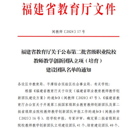 日前,福建省教育廳公布第二批省級職業(yè)院校教師教學(xué)創(chuàng)新團(tuán)隊(duì)立項(xiàng)(培育)建設(shè)團(tuán)隊(duì)名單。我校藥學(xué)專業(yè)創(chuàng)新團(tuán)隊(duì)入選第二批省級職業(yè)院校教師教學(xué)創(chuàng)新團(tuán)隊(duì)立項(xiàng)建設(shè)團(tuán)隊(duì)名單,醫(yī)學(xué)檢驗(yàn)技術(shù)專業(yè)群創(chuàng)新團(tuán)隊(duì)入選第二批省級職業(yè)院校教師教學(xué)創(chuàng)新團(tuán)隊(duì)培育建設(shè)團(tuán)隊(duì)名單。