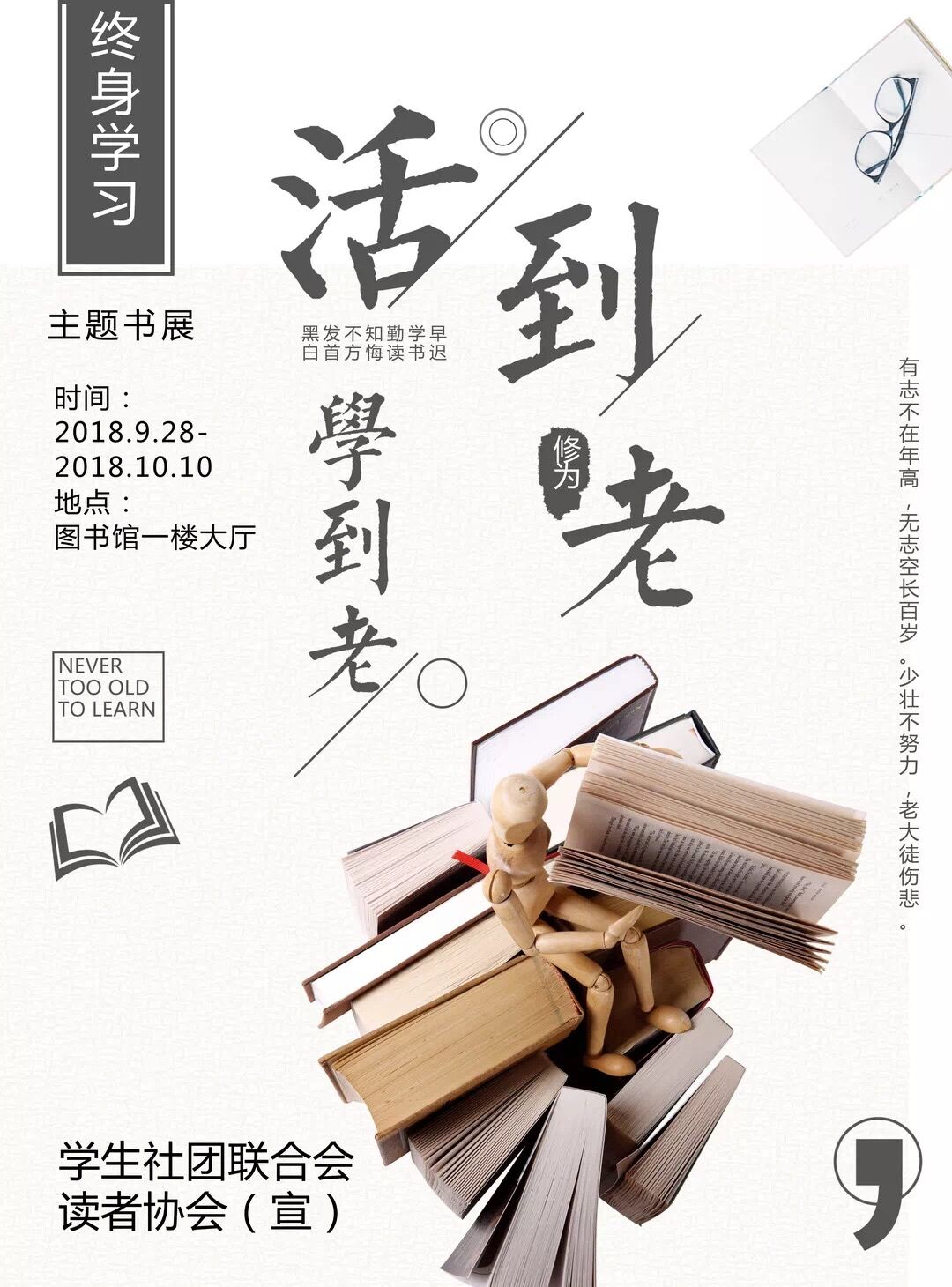 在“全民終身學(xué)習(xí)活動(dòng)周”來臨之際,圖書館特舉辦“活到老、學(xué)到老”主題書展,精選各類好書百余冊(cè)在圖書館一樓大廳進(jìn)行展示,持續(xù)時(shí)間為2018年9月28日至10月10日,歡迎師生讀者前來借閱。