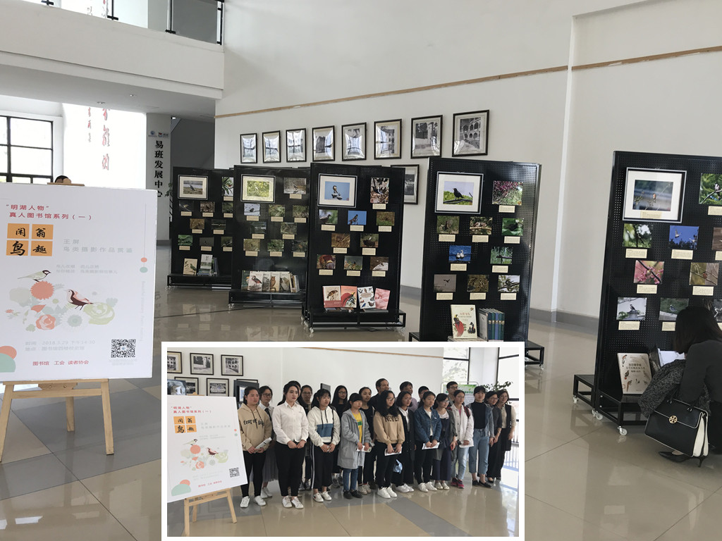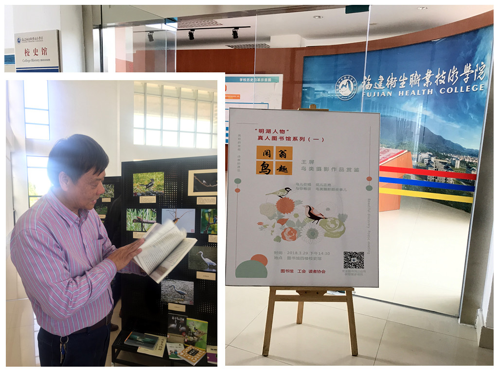2018年3月29日14:30,圖書(shū)館在4樓校史館舉辦了第一期“明湖人物”真人圖書(shū)館,本期活動(dòng)主題是“閑翁鳥(niǎo)趣”鳥(niǎo)類(lèi)攝影作品鑒賞,主講嘉賓是福建省觀(guān)鳥(niǎo)協(xié)會(huì)會(huì)員王屏老師(原我院后勤管理處處長(zhǎng)),學(xué)院工會(huì)副主席洪常青也蒞臨了本次活動(dòng)。