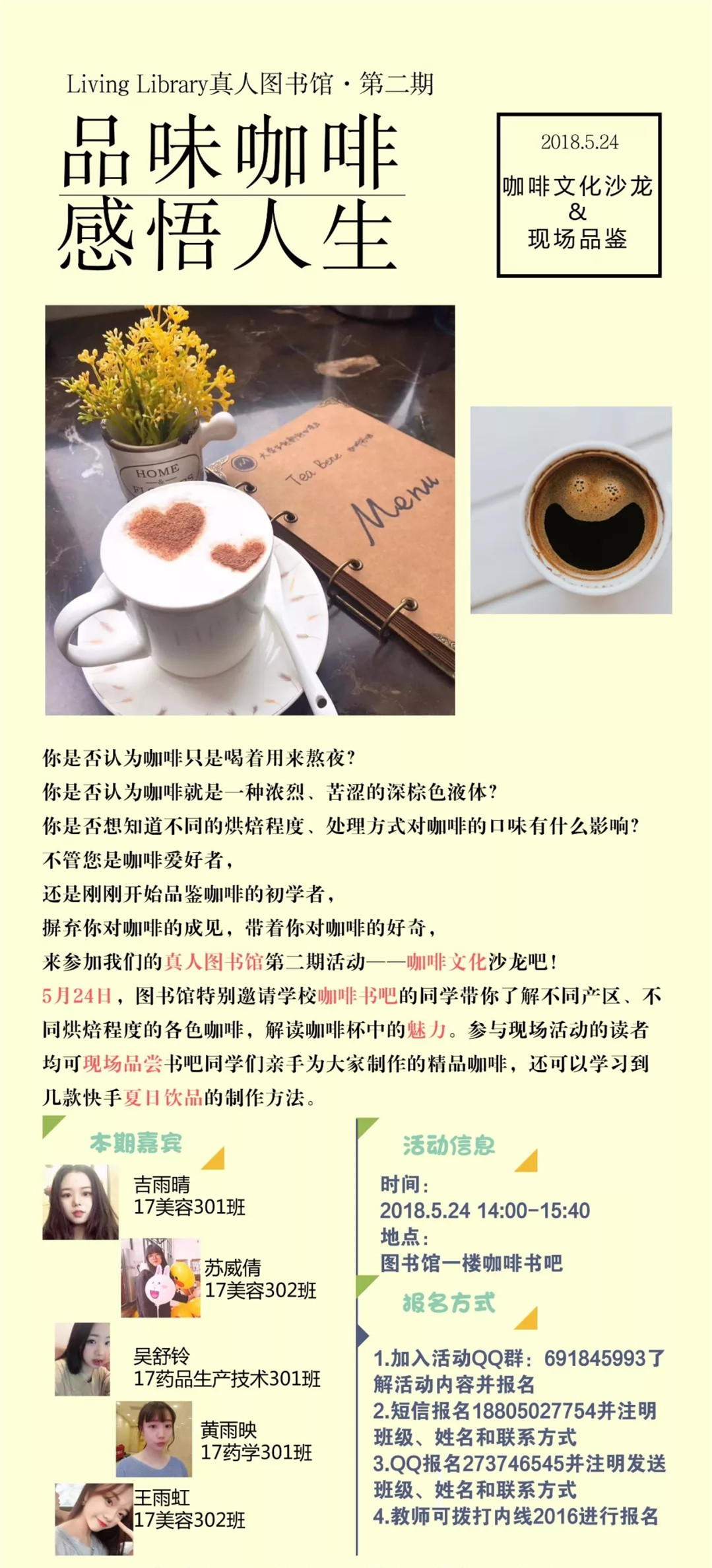 第二期真人圖書館——“咖啡文化沙龍&現(xiàn)場品鑒”活動(dòng)將于5月24日(本周四)下午2點(diǎn)在圖書館一樓咖啡書吧舉行,屆時(shí)歡迎師生讀者的參與。