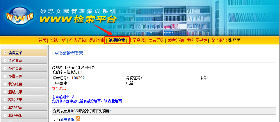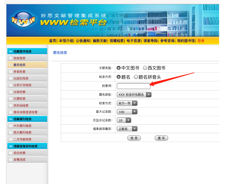 3、點擊“館藏書目檢索”,進(jìn)入書目檢索界面。