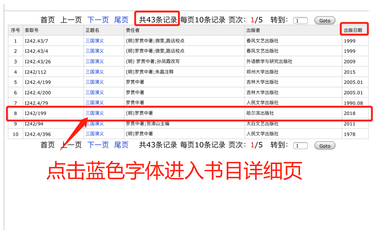 5、進(jìn)入檢索目錄頁,查看檢索結(jié)果,點擊所需書目的正題名,進(jìn)入書目詳情頁;