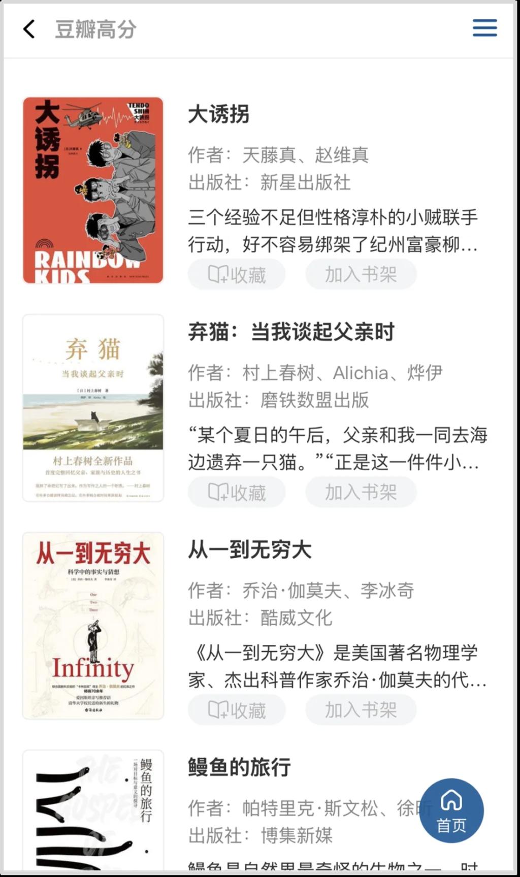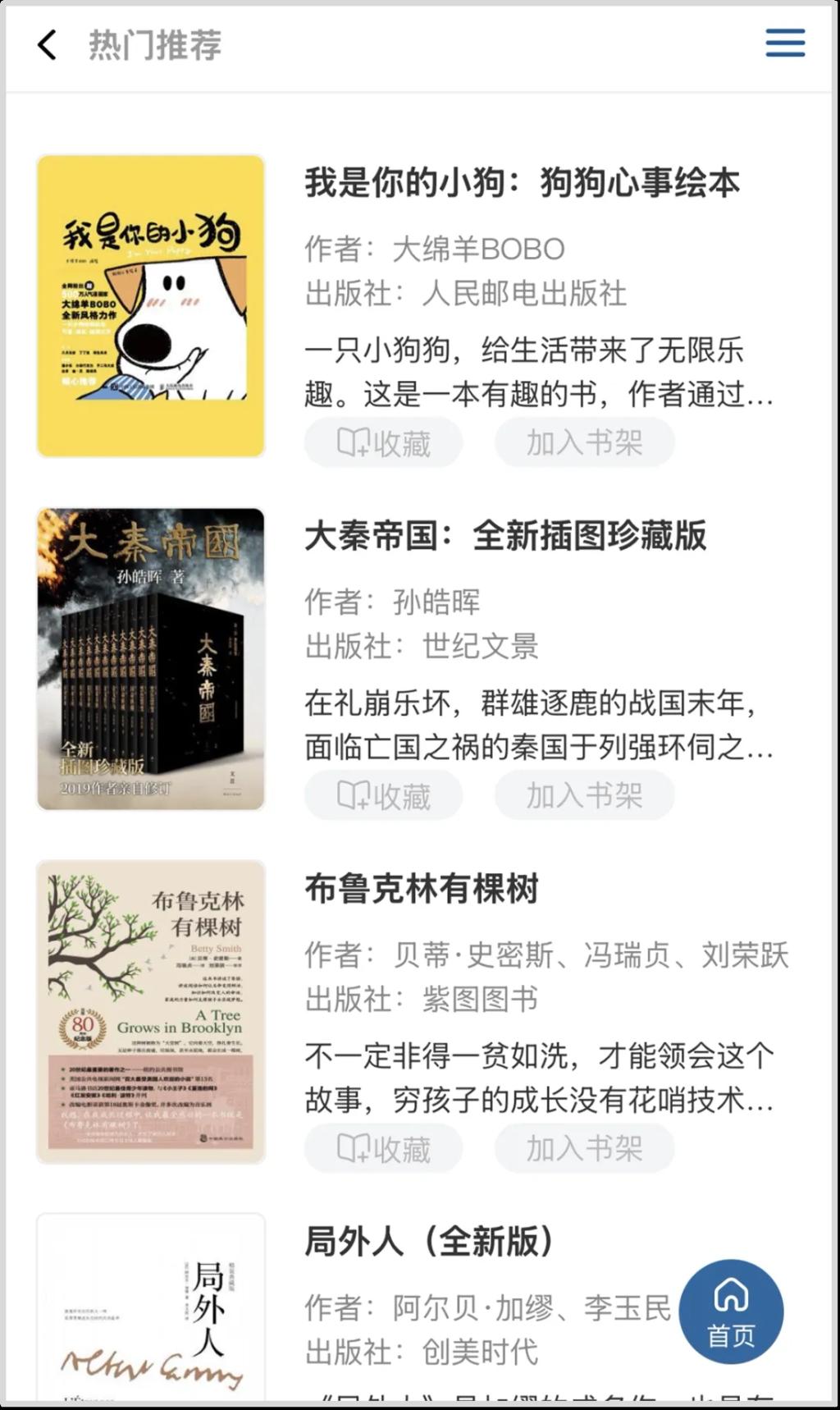 除經(jīng)典典籍圖書以外,平臺(tái)緊跟社會(huì)熱點(diǎn)與大眾閱讀趨勢(shì),收錄暢銷文學(xué)作品、影視原著、新書速遞、豆瓣好書等。