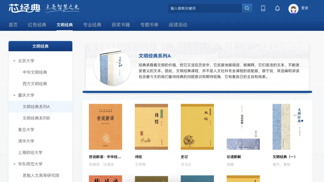 芯經(jīng)典文明典籍電子書平臺(tái)以經(jīng)典圖書為基礎(chǔ),匯聚通識(shí)領(lǐng)域及學(xué)科專業(yè)領(lǐng)域的權(quán)威專家學(xué)者,共同甄選并推薦書單。平臺(tái)整合紅色經(jīng)典:精選四史、新時(shí)代中國(guó)夢(mèng)、紅色故事為題材、文明經(jīng)典、專業(yè)經(jīng)典等多維度優(yōu)秀資源,收錄諾貝爾文學(xué)獎(jiǎng)、茅盾文學(xué)獎(jiǎng)、魯迅文學(xué)獎(jiǎng)等多項(xiàng)全球頂尖文學(xué)殿堂級(jí)的圖書,除經(jīng)典典籍圖書以外,平臺(tái)緊跟社會(huì)熱點(diǎn)與大眾閱讀趨勢(shì),收錄暢銷文學(xué)作品、影視原著、新書速遞、豆瓣好書等作品,構(gòu)建起全方位、多層次的經(jīng)典閱讀與學(xué)習(xí)體系。