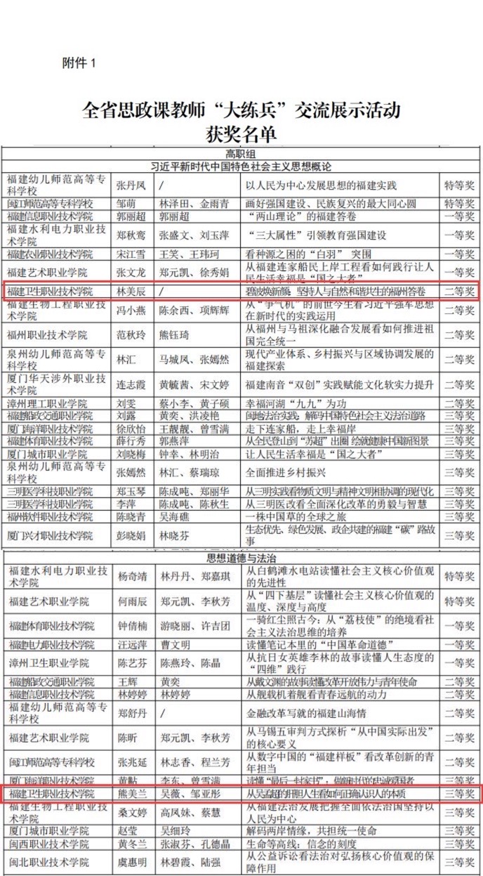 近日,《福建省教育廳關(guān)于公布全省思政課教師 “大練兵”交流展示活動(dòng)評(píng)選結(jié)果的通知》文件公布,我校馬克思主義學(xué)院教師在活動(dòng)中表現(xiàn)突出,榮獲二等獎(jiǎng)1項(xiàng)、三等獎(jiǎng)1項(xiàng)。