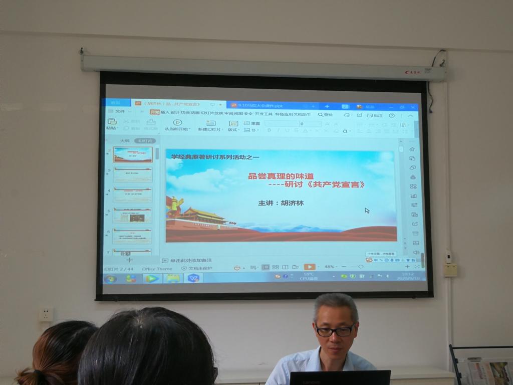 接著,大家一起學(xué)習(xí)了《黨政機(jī)關(guān)厲行節(jié)約反對(duì)浪費(fèi)條例》和《思政課是落實(shí)立德樹(shù)人根本任務(wù)的關(guān)鍵課程》,新任思政課教師羅蕓就學(xué)習(xí)《思政課是落實(shí)立德樹(shù)人根本任務(wù)的關(guān)鍵課程》交流了3點(diǎn)學(xué)習(xí)心得,一是不忘立德樹(shù)人初心;二是以“六個(gè)要”為標(biāo)準(zhǔn)找差距;三是按照“八個(gè)相統(tǒng)一”的要求積極參與思政課改革。學(xué)習(xí)完后,開(kāi)展研學(xué)馬克思主義經(jīng)典原著活動(dòng),第一講由概論教研室主任胡濟(jì)林老師主講《品嘗真理的味道——研討<共產(chǎn)黨宣言>》。