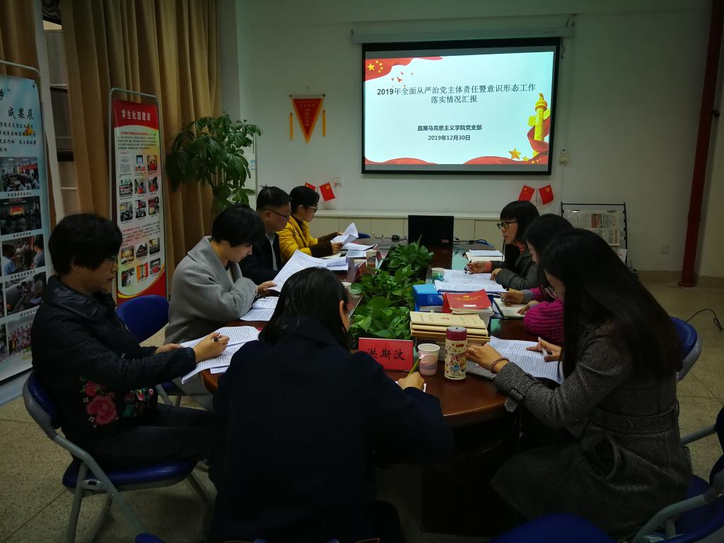 2019年12月30日下午,學校全面從嚴治黨主體責任暨意識形態(tài)工作專項巡查“回頭看”交叉巡查組組長曾武祈書記、成員阮秋容、吳華、程劍芬一行到馬克思主義學院行政樓107會議室檢查2019年度直屬馬克思主義學院黨支部全面從嚴治黨主體責任暨意識形態(tài)工作落實情況。直屬馬克思主義學院黨支部全體委員參加會議。