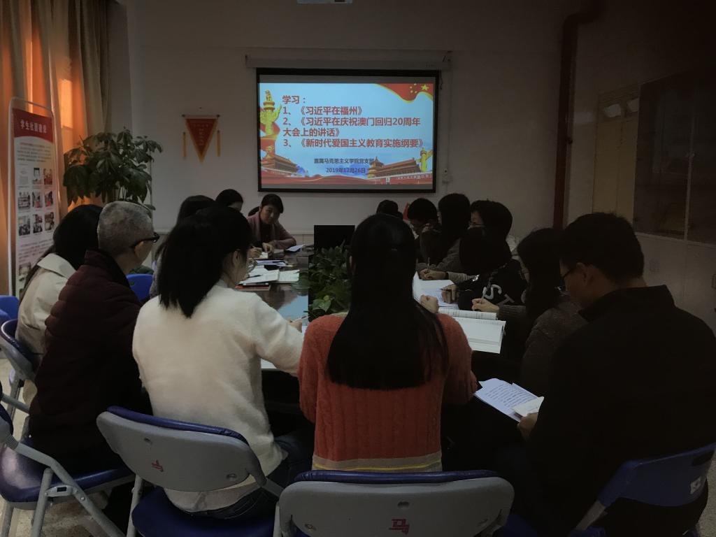 2019年12月26日上午,直屬馬克思主義學(xué)院黨支部組織全體黨員集中學(xué)習(xí)《習(xí)近平在福州》、《習(xí)近平在慶祝澳門回歸20周年大會(huì)上的講話》、《新時(shí)代愛國主義教育實(shí)施綱要》。活動(dòng)由黨支部書記熊美蘭主持,支部全體教師黨員參加了活動(dòng)。
