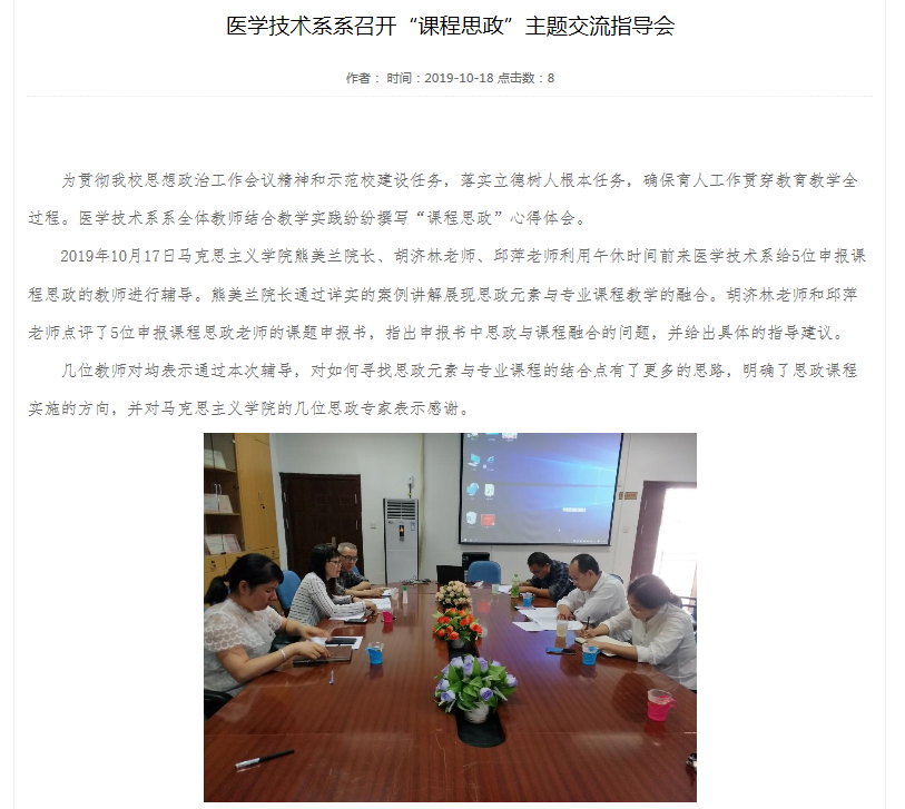 為貫徹全國(guó)高校思想政治工作會(huì)議精神和我校立德樹人人才培養(yǎng)的目標(biāo)要求,將思政教育元素與專業(yè)課程有效融合,切實(shí)做到“三全育人”,馬院熊美蘭院長(zhǎng)、胡濟(jì)林老師和邱萍老師等一行來到醫(yī)學(xué)技術(shù)系會(huì)議室與5位專業(yè)課教師開展“課程思政”課程建設(shè)項(xiàng)目交流指導(dǎo)。具體內(nèi)容詳見下面新聞:
