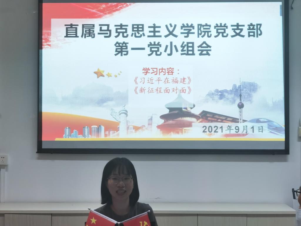 2021年9月1日,直屬馬克思主義學(xué)院黨支部第一黨小組在行政樓107開展理論學(xué)習(xí),學(xué)習(xí)《習(xí)近平在福建》《新征程面對(duì)面》,會(huì)議由宣傳委員羅蕓主持。