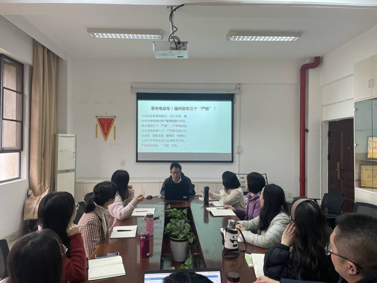 張?zhí)煳纳钊敕治瞿暇┯昊ㄅ_區(qū)電動車火災(zāi)事故發(fā)生原因,并結(jié)合福州市住房保障和房產(chǎn)管理局提出的“三個嚴(yán)禁”,警示全體教師黨員吸取教訓(xùn),引以為戒,建立正確的用車觀念和充電方法。