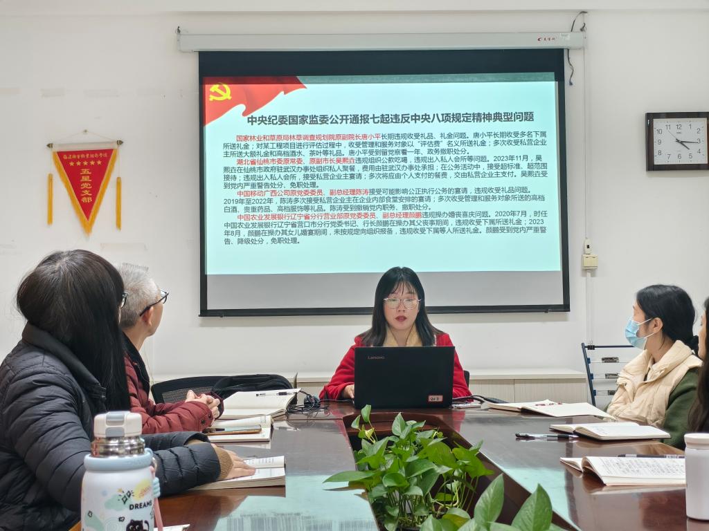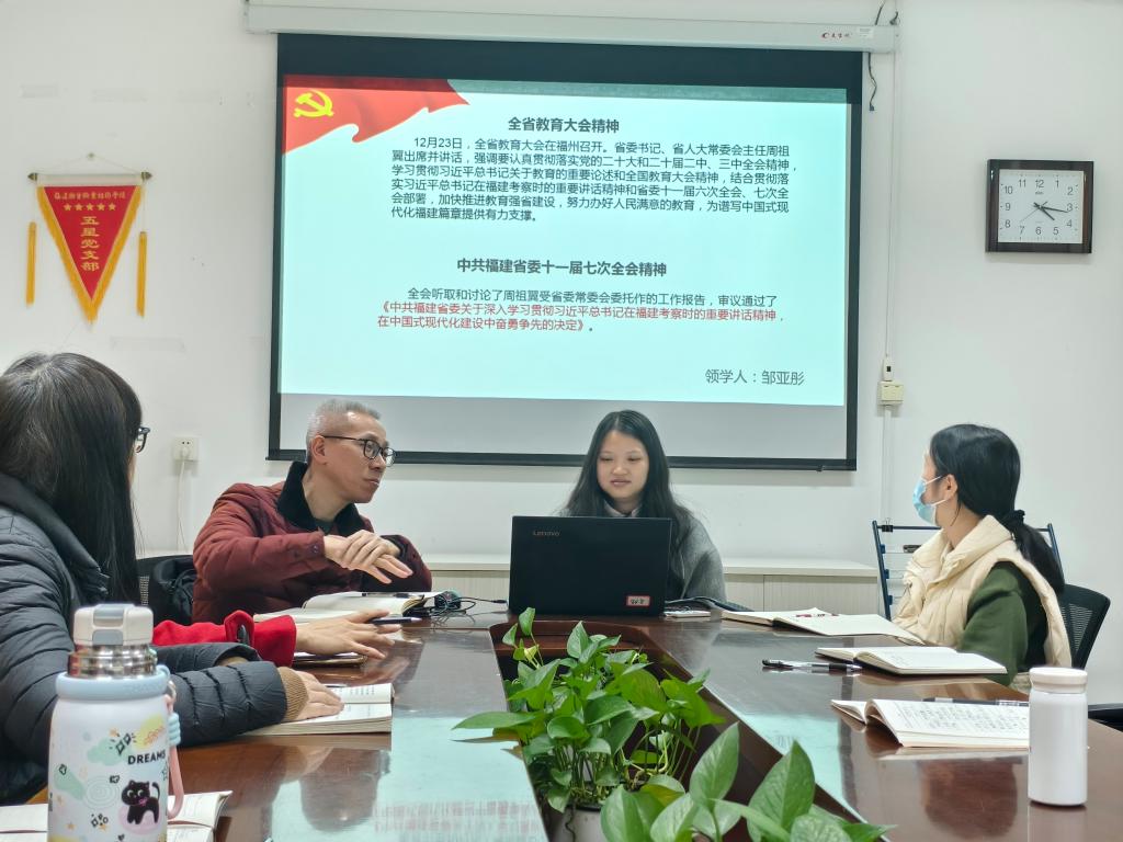 會上,蔣楠同志領學習近平總書記重要文章《深入推進黨的自我革命》。文章指出,黨的十八大以來,在推進全面從嚴治黨的偉大實踐中,我們不斷進行實踐探索和理論思考,在毛澤東同志當年給出“讓人民來監(jiān)督政府”的第一個答案基礎上,給出了第二個答案,那就是不斷推進黨的自我革命。鄒亞彤同志領學習近平總書記在福建考察時的重要講話精神、中共福建省委十一屆七次全會精神、全省教育大會精神。楊盈同志結合2025年元旦春節(jié)期間正風肅紀工作,領學中央紀委國家監(jiān)委公開通報七起違反中央八項規(guī)定精神典型問題。