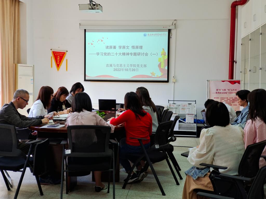 為學(xué)習(xí)宣傳和研究闡釋黨的二十大精神,用習(xí)近平新時代中國特色社會主義思想凝心鑄魂,引領(lǐng)新時代青年學(xué)生踔厲奮發(fā)、勇毅前行,2022年10月20日,直屬馬克思主義學(xué)院黨支部在會議室107開展黨的二十大報(bào)告專題研討會,活動由黨支部書記熊美蘭主持。