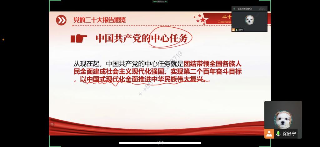 聆聽報(bào)告,展望未來。中國人民的前進(jìn)動(dòng)力更加澎湃、奮斗精神更加昂揚(yáng)、必勝信念更加堅(jiān)定。徐舒寧從1到10,和同學(xué)們一起學(xué)習(xí)黨的二十大報(bào)告中的關(guān)鍵論述。即一個(gè)中任務(wù)、兩步走、三個(gè)務(wù)必、“四個(gè)自信”、“五個(gè)必由之路”、六個(gè)堅(jiān)持、七個(gè)安全、八項(xiàng)規(guī)定、中國式現(xiàn)代化九個(gè)方面的要求、十個(gè)加快建設(shè)。同時(shí)向同學(xué)們分享了幾點(diǎn)學(xué)習(xí)領(lǐng)會(huì)黨的二十大精神的心得,提出廣大青年要堅(jiān)定不移聽黨話、跟黨走,懷抱夢想又腳踏實(shí)地,敢想敢為又善作善成,立志做有理想、敢擔(dān)當(dāng)、能吃苦、肯奮斗的新時(shí)代好青年,讓青春在全面建設(shè)社會(huì)主義現(xiàn)代化國家的火熱實(shí)踐中綻放絢麗之花。