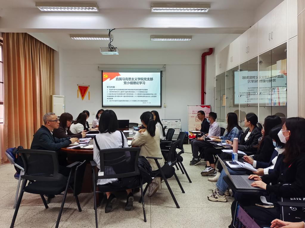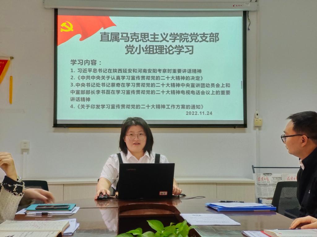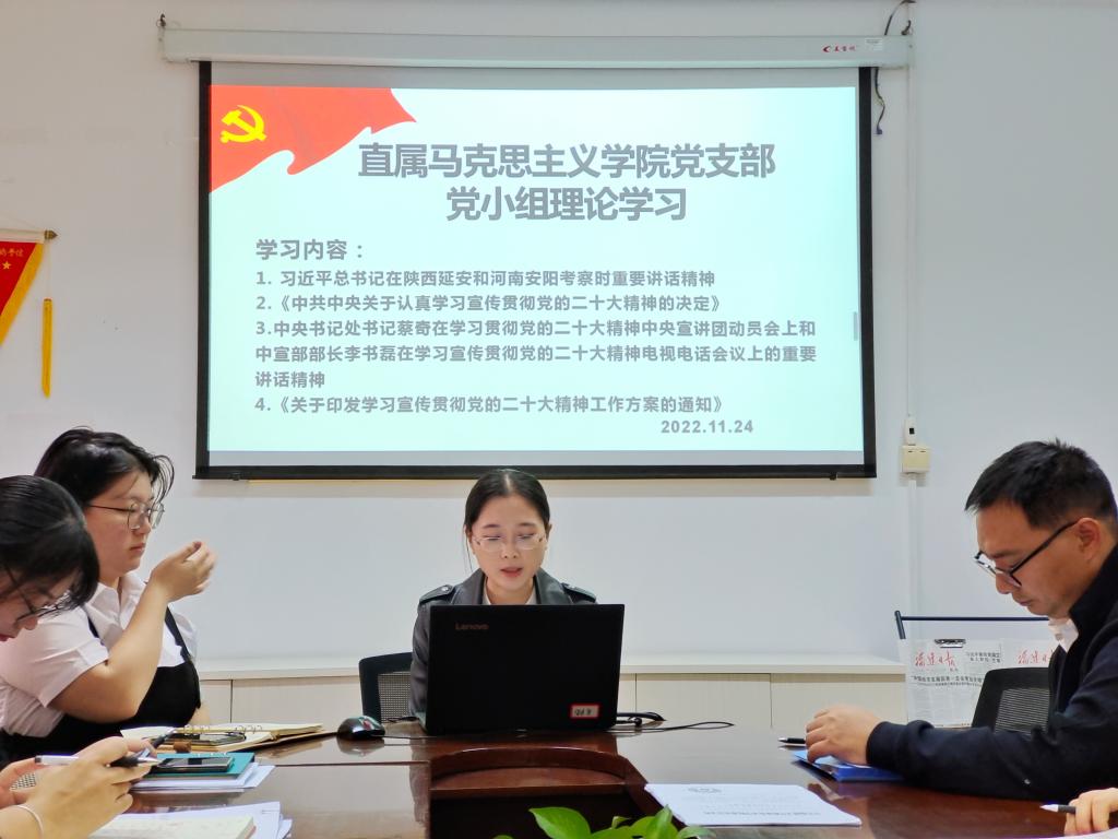 2022年11月24日,直屬馬克思主義學(xué)院黨支部學(xué)習(xí)了習(xí)近平總書記在陜西延安和河南安陽考察時(shí)重要講話精神、《中共中央關(guān)于認(rèn)真學(xué)習(xí)宣傳貫徹黨的二十大精神的決定》、中央書記處書記蔡奇在學(xué)習(xí)貫徹黨的二十大精神中央宣講團(tuán)動員會上和中宣部部長李書磊在學(xué)習(xí)宣傳貫徹黨的二十大精神電視電話會議上的重要講話精神,以及傳達(dá)學(xué)習(xí)學(xué)院《關(guān)于印發(fā)學(xué)習(xí)宣傳貫徹黨的二十大精神工作方案的通知》等內(nèi)容。本次學(xué)習(xí)活動由來朋珍同志主持。