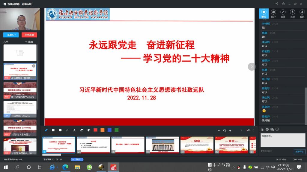 2022年11月28日晚,習(xí)近平新時(shí)代中國特色社會(huì)主義思想讀書社致遠(yuǎn)隊(duì)通過學(xué)習(xí)通線上平臺(tái)集中開展“永遠(yuǎn)跟黨走 奮進(jìn)新征程——學(xué)習(xí)黨的二十大精神”主題宣講活動(dòng),由指導(dǎo)老師江洪主講,2022級(jí)讀書社致遠(yuǎn)隊(duì)新老成員30多人按時(shí)參加了活動(dòng)。