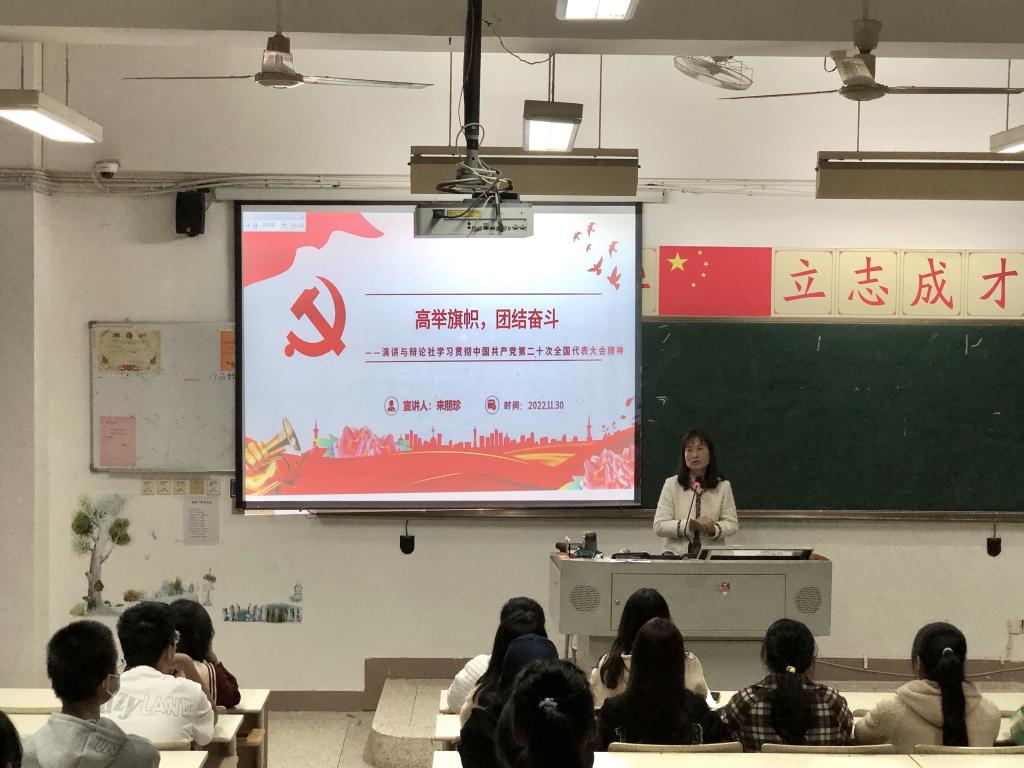 傳精神火種,聚奮進(jìn)力量。為深入學(xué)習(xí)宣傳貫徹黨的二十大精神,2022年11月30日,演講與辯論社指導(dǎo)老師來朋珍在教學(xué)樓315教室對(duì)全體社團(tuán)成員開展了“高舉旗幟奮斗團(tuán)結(jié)”為主題的學(xué)習(xí)黨的二十大精神宣講。