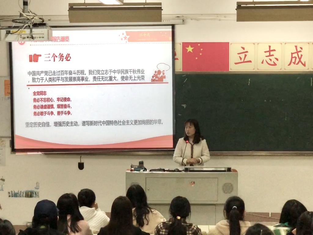 來朋珍老師從“三個(gè)務(wù)必”“五個(gè)重大原則”“五個(gè)必由之路”等方面詳細(xì)介紹了黨的二十大報(bào)告的一系列重要論點(diǎn),引導(dǎo)同學(xué)們深入學(xué)習(xí)貫徹黨的二十大精神,深刻理解黨的二十大召開的重大意義,同時(shí)也激勵(lì)同學(xué)們更加緊密地團(tuán)結(jié)在以習(xí)近平同志為核心的黨中央周圍,高舉中國(guó)特色社會(huì)主義偉大旗幟,堅(jiān)定道路自信、理論自信、制度自信、文化自信,為全面建設(shè)社會(huì)主義現(xiàn)代化國(guó)家、全面推進(jìn)中華民族偉大復(fù)興而團(tuán)結(jié)奮斗勇敢奮斗。