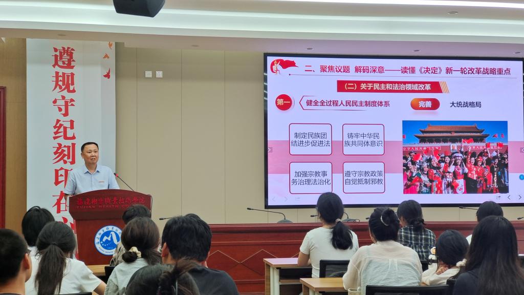 2024年9月12日,校黨委書記曾武祈在行政樓六樓會議室為馬克思主義學(xué)院黨總支全體教師黨員作題為“同心擘畫改革新藍(lán)圖 攜手奮進(jìn)強(qiáng)國新征程”黨課。