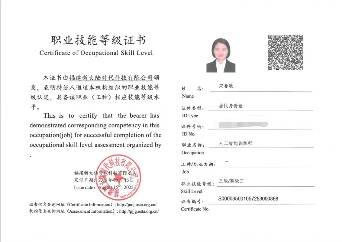 值得一提的是,在嚴(yán)格考核后,宋春歌老師獲得了由新大陸科技有限公司頒發(fā)的“人工智能訓(xùn)練師(三級(jí))”證書及“人工智能應(yīng)用講師”證書。雙重認(rèn)證不僅是對(duì)教師技術(shù)能力與教學(xué)能力的權(quán)威認(rèn)可,也為職業(yè)院校申報(bào)“雙師型”教師、優(yōu)化專業(yè)師資結(jié)構(gòu)提供了有力支撐。