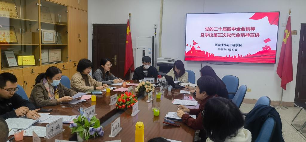 為推動黨的二十屆四中全會精神與學(xué)校第三次黨代會精神入腦入心,進(jìn)一步統(tǒng)一思想、凝聚合力,引導(dǎo)全院師生將智慧和力量匯聚到中央決策部署與學(xué)校發(fā)展大局中來。11月27日,校黨委委員、副校長黃銘珊赴醫(yī)學(xué)技術(shù)與工程學(xué)院開展專題宣講。醫(yī)工學(xué)院領(lǐng)導(dǎo)班子成員、黨支部書記、輔導(dǎo)員代表、教研室主任參加會議,會議由學(xué)院黨委書記柯瓊鶯主持。