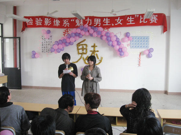 檢驗(yàn)影像系于2007年4月26日下午在教學(xué)樓205舉行了“魅力男生、女生”預(yù)選賽,本次活動(dòng)有10余名選手參加,通過(guò)“個(gè)性才藝,你我爭(zhēng)風(fēng)”、綜合知識(shí)問(wèn)答、形象展示和“尋找同伴,同舟共濟(jì)”4輪的比賽,最終評(píng)選出一、二、三等獎(jiǎng)、鼓勵(lì)獎(jiǎng)和最佳人氣獎(jiǎng)。