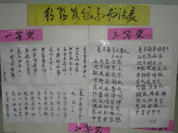 為豐富同學(xué)們的課余活動(dòng),提高對中國書法的鑒賞能力,同時(shí)發(fā)掘系部書法方面的優(yōu)秀人才,檢驗(yàn)影像系于2007年10月11日下午4:00在系二階舉行書法比賽。本次比賽共收到參賽作品50余件,其參賽作品之多,書法技藝之高超,令評委驚喜。經(jīng)過評委的認(rèn)真評選,最終選出一等獎(jiǎng)2名,二等獎(jiǎng)4名,三等獎(jiǎng)6名,優(yōu)秀獎(jiǎng)8名,而所有獲獎(jiǎng)?wù)叨紝@得相應(yīng)的素質(zhì)拓展加分。 漢語是世界上活著的最古老的語言,而用文字形成書法藝術(shù)的又只有漢字,這是我們應(yīng)該引以驕傲和自豪的事。舉行書法比賽對于弘揚(yáng)中華傳統(tǒng)文化、陶冶情操都是大有裨益的。相信每一位參賽者在這次比賽中都有所收獲,讓同學(xué)們從中既能感受到中國書法藝術(shù)的魅力,又能被激發(fā)起強(qiáng)烈的學(xué)習(xí)熱情,讓這一國粹能綿延不斷傳承下去。