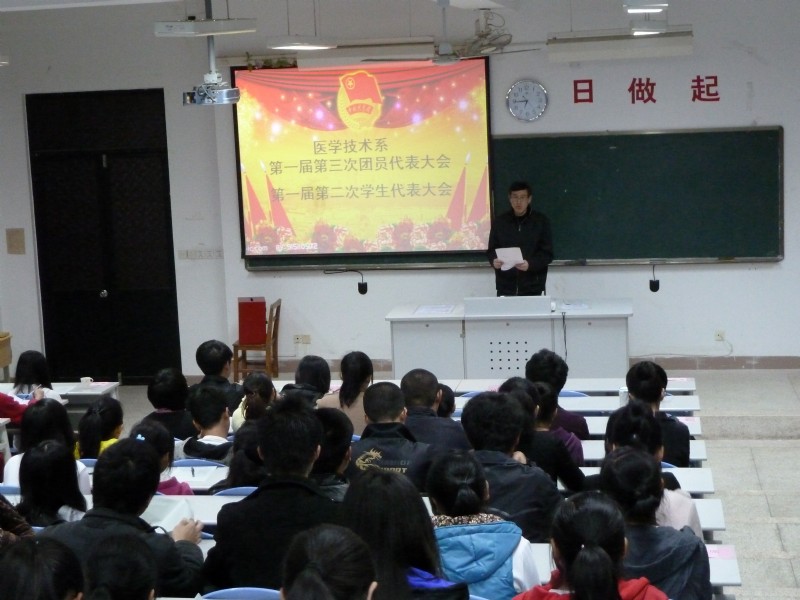 2011年4月6日晚,醫(yī)學(xué)技術(shù)系第一屆第三次團(tuán)員代表大會(huì)暨第一屆第二次學(xué)生代表大會(huì)在教學(xué)樓210召開(kāi)。醫(yī)學(xué)技術(shù)系黨總支副書(shū)記洪聿榮老師、團(tuán)總支副書(shū)記郭淼麗老師、全體輔導(dǎo)員、各班學(xué)生代表及各兄弟系部團(tuán)、學(xué)干部參加了此次大會(huì)。會(huì)議由系團(tuán)總支副書(shū)記蘭浩敏主持。