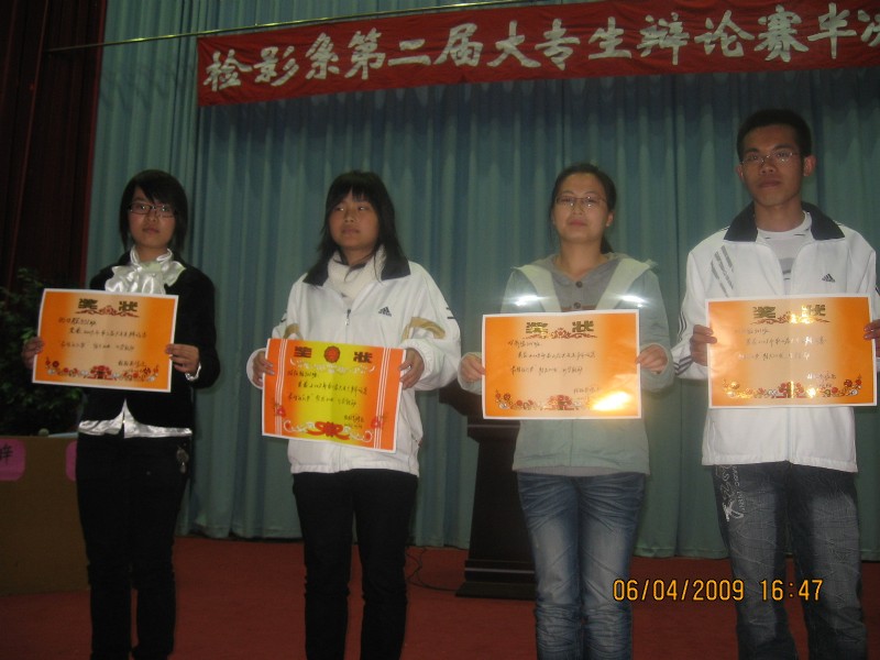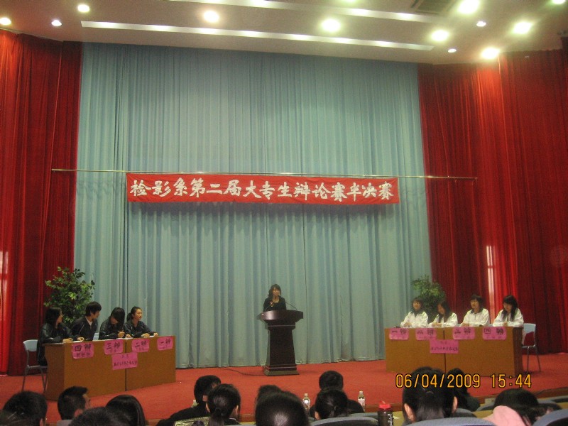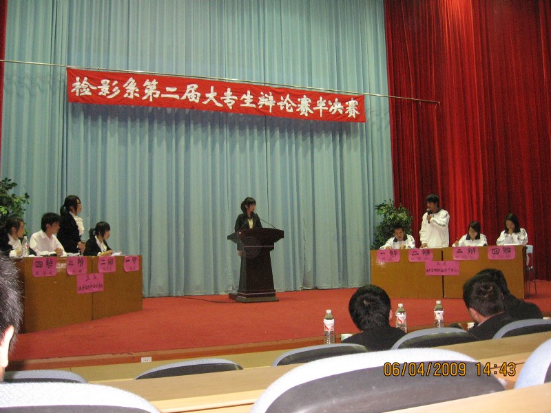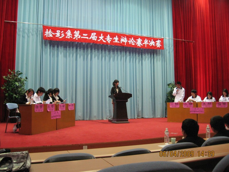 檢驗影像系于4月7日下午在學術廳舉行第二屆大專生辯論賽的兩場半決賽。擔任此次比賽的評委是:莊海林老師、李淼淼老師、宋楓老師、傅衍達老師和郭永慶老師。本次比賽采用國際大專生辯論賽賽制,增設了攻辯階段,使整場比賽更具看點。
