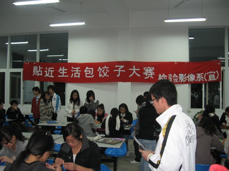 為給同學(xué)們提供一個互相交流、娛樂的平臺,進(jìn)一步增進(jìn)同學(xué)們的感情,增強(qiáng)班級凝聚力,檢驗影像系于11月19日晚上7:30在明湖餐廳舉辦了“貼近生活”的包餃子比賽。各班選派5位同學(xué)參加,輔導(dǎo)員和學(xué)生會干部擔(dān)任這次比賽評委。