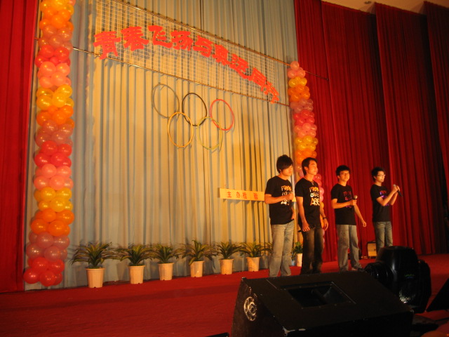 整臺晚會節(jié)目新穎多樣、精彩紛呈,學(xué)術(shù)廳里無不洋溢著歡樂的氣氛。有借舞抒情的藏族舞《拾桑梅雜》,阿娜多姿的傣族舞《有一個美麗的地方》,舞姿翩翩的古典舞《茉莉花》和火暴的勁舞《Peer Less》。小品《思想工作》、《泰坦尼克》、《唐伯虎點秋香》不時引起場下陣陣笑聲。歌曲《第一時間》、《廣島之戀》,吉他彈唱,黃梅戲《誰料皇榜中狀元》也為晚會增色不少。以奧運(yùn)為主題的小品《友愛之間》、歌曲《夢想在望》、詩朗誦《08奧運(yùn) 無限精彩》將氣氛一次又一次地推向高潮。最后,晚會在《相親相愛一家人》中落下了帷幕。